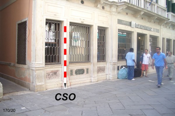 [{"simbolo_contrassegno":"B3","materializzazione":"(CSO) – CIRCOLO INCISO – nello spigolo della prima risega della greca di marmo ai piedi della facciata all'estrema sinistra della stessa."},{"simbolo_contrassegno":"V1","materializzazione":"(CSV) – MENSOLA – (CNR) nella parete dell'edificio in fregio a Banca Intesa sul lato di Calle del Traghetto a 3.40 m da via 22 Marzo."},{"simbolo_contrassegno":"V4","materializzazione":"(CSV') – PIASTRINA DI ALTRO ENTE – (UIMA) a destra del csv a circa 0.40 m (infossato nell'intonaco)."}]