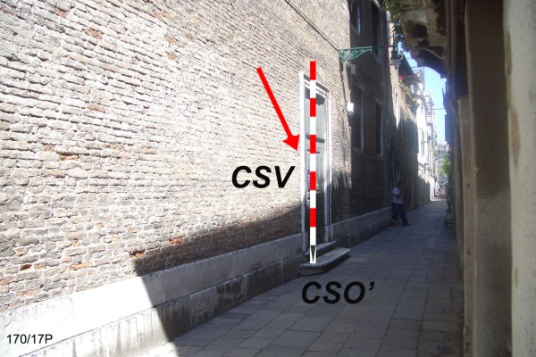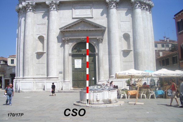 | Contrassegni | [{"simbolo_contrassegno":"B5","materializzazione":"(CSO) – DISCO METALLICO IMPIOMBATO – sul basamento del pozzo, dalla parte opposta alla chiesa."},{"simbolo_contrassegno":"B3","materializzazione":"(CSO') – CIRCOLO INCISO – a sinistra del primo gradino della seconda porta laterale di Calle del Traghetto."},{"simbolo_contrassegno":"V5","materializzazione":"(CSV) – PIASTRINA DI ALTRO ENTE – (UIMA) sulla parete della chiesa in corrispondenza del cso'."}] |