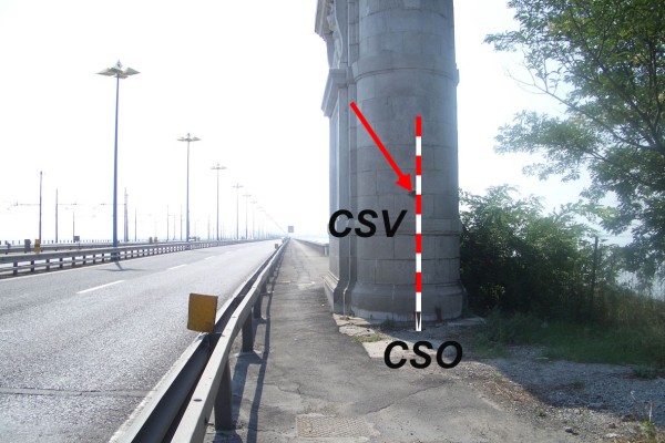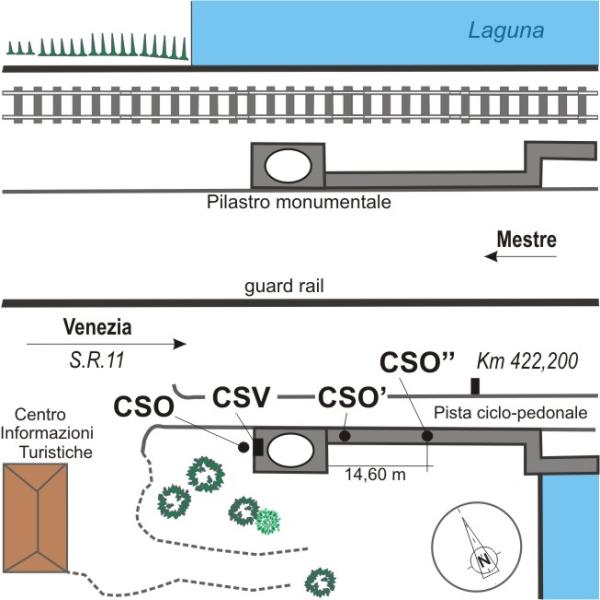 | Contrassegni | [{"simbolo_contrassegno":"P5","materializzazione":"(CSO) – Pozzetto rialzato con tubo in PVC e protetto da coperchio in ghisa, interrato alla base, klato volto verso Mestre, del pilastro monumentale di destra all'inizio del ponte, in direzione Venezia."},{"simbolo_contrassegno":"B2","materializzazione":"(CSO') – Chiodo anonimo con foro, infisso sulla spalla del parapetto appena superato il pilastro monumentale di destra del Ponte della Libert\u00e0 in direzione Venezia, circa 12 m prima del CSO''. Attualmente la parte di balaustra su cui insiste il contrassegno risulta smossa e rialzata."},{"simbolo_contrassegno":"B4","materializzazione":"(CSO'') – Centrino universale Inox infisso sulla spalla del parapetto a circa 14,60 m dal pilastro monumentale di destra del Ponte della Libert\u00e0 in direzione Venezia, in corrispondenza della pietra chilometrica 422,200 della S.R. 11."},{"simbolo_contrassegno":"V2","materializzazione":"(CSV) – Piastrina a barilotto infissa sul pilastro monumentale, in corrispondenza del CSO."}] |