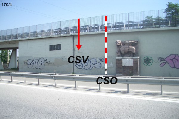 [{"simbolo_contrassegno":"B1","materializzazione":"(CSO) – Bullone infisso nel muro della rampa del cavalcavia per Trieste, a sinistra della lapide raffigurante il leone di S. Marco."},{"simbolo_contrassegno":"V5","materializzazione":"(CSV) – Targa con linea incisa infissa in corrispondenza del cso."}]