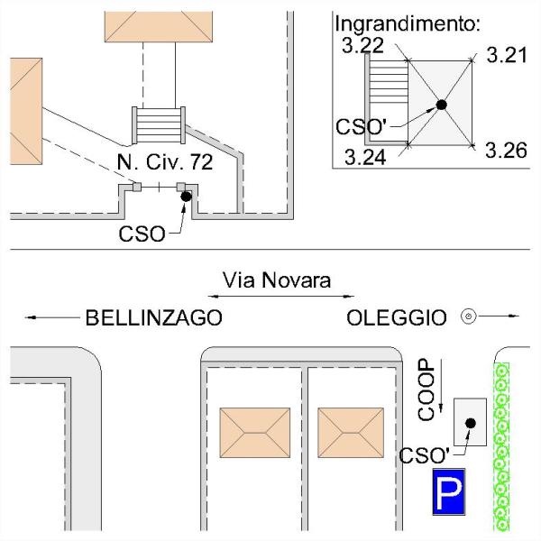 | Contrassegni | [{"simbolo_contrassegno":"P5","materializzazione":"(CSO) – Pozzetto interrato alla base del pilastro di destra del cancello d'accesso alla propriet\u00e0 al numero civico 72."},{"simbolo_contrassegno":"B4","materializzazione":"(CSO') – Centrino universale infisso sulla sommit\u00e0 della cabina ENEL, sita nel parcheggio a destra andando verso il centro di Oleggio, adiacente al supermercato."}] |