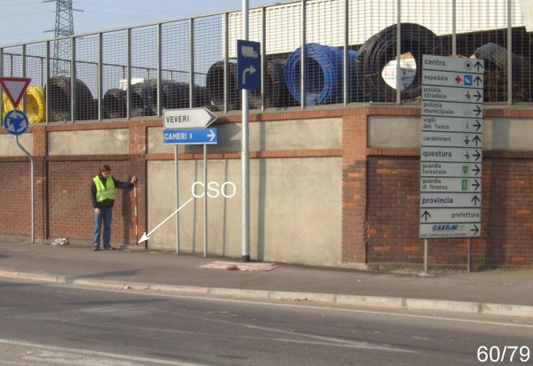 | Contrassegni | [{"simbolo_contrassegno":"B1","materializzazione":"(CSO) – Bullone infisso sul muro di contenimento in mattoni della ditta ISER, sulla terza lesena dall'incrocio con Via delle Americhe."}] |