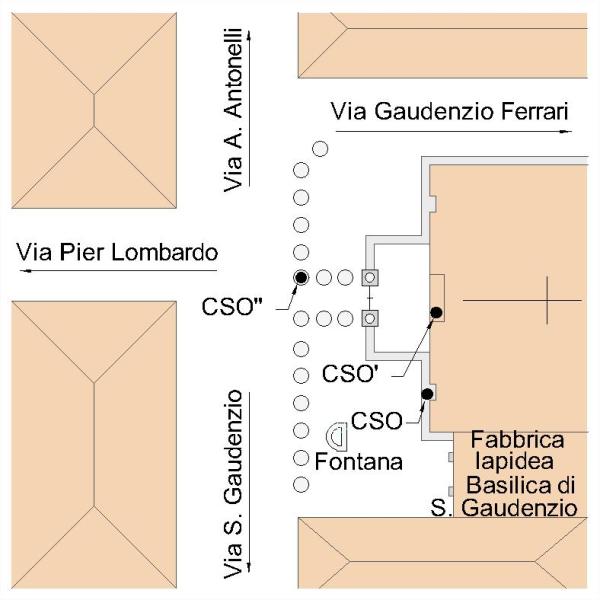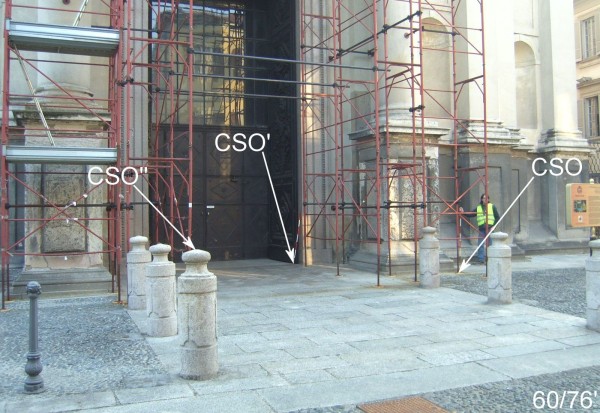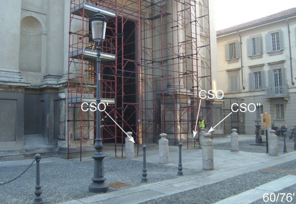 [{"simbolo_contrassegno":"B4","materializzazione":"(CSO) – Centrino universale infisso su un gradino alla base della colonna di destra della facciata, spigolo di destra in corrispondenza della lesena."},{"simbolo_contrassegno":"B3","materializzazione":"(CSO') – Cerchio inciso sulla soglia della porta principale, a destra entrando."},{"simbolo_contrassegno":"B3","materializzazione":"(CSO'') – Cerchio inciso sulla sommit\u00e0 del primo colonnino, a sinistra procedendo verso la porta principale, lato strada."}]