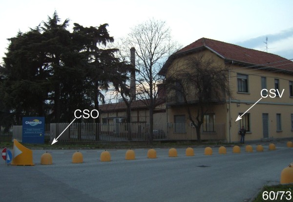 [{"simbolo_contrassegno":"B1","materializzazione":"(CSO) – Bullone infisso sul muretto di recinzione della Granarolo Spa lato Strada Statale, presso lo spigolo destro."},{"simbolo_contrassegno":"V6","materializzazione":"(CSV) – Piastrina con cilindretto infissa sulla parete del primo fabbricato a sinistra entrando, a 1,30 m dallo spigolo sinistro."}]