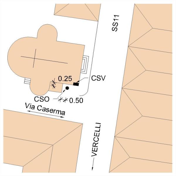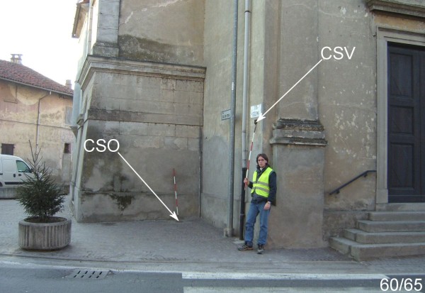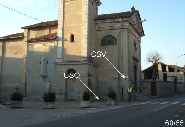 | Contrassegni | [{"simbolo_contrassegno":"P3","materializzazione":"(CSO) – Pozzetto in ghisa posto alla base del campanile vicino all'angolo formato con la parete laterale sinistra della chiesa."},{"simbolo_contrassegno":"V1","materializzazione":"(CSV) – Mensola infissa sulla parete laterale sinistra della chiesa, spigolo di destra."}] |