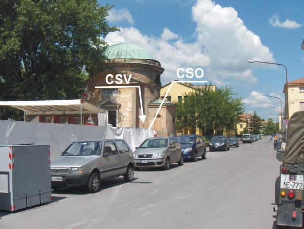 | Contrassegni | [{"simbolo_contrassegno":"P3","materializzazione":"(CSO) – Pozzetto posto alla base della parete laterale lato via Recchi, in corrispondenza dell'angolo formato dal corpo sporgente, che si trova a destra dell'ingresso."},{"simbolo_contrassegno":"V1","materializzazione":"(CSV) – Mensola infissa nella parete in corrispondenza del CSO."}] |