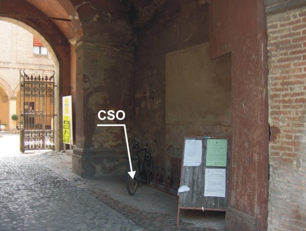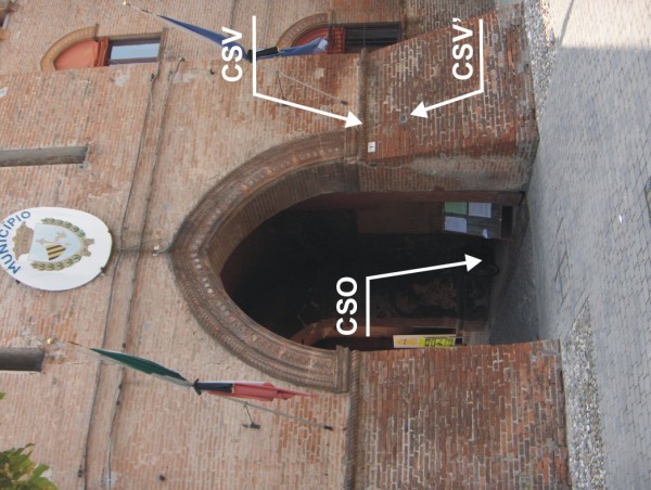 | Contrassegni | [{"simbolo_contrassegno":"P4","materializzazione":"(CSO) – Pozzetto posto nello spigolo NORD-EST entrando nella torre del castello."},{"simbolo_contrassegno":"V3","materializzazione":"(CSV) – Piastrina antica infissa a destra dela porta d'accesso al castello."},{"simbolo_contrassegno":"V4","materializzazione":"(CSV') – Piastrina C.B.V.V.R. (Consorzio Bonifica Valli Vecchio Reno) n\u00b0 851 infissa sotto il CSV."}] |