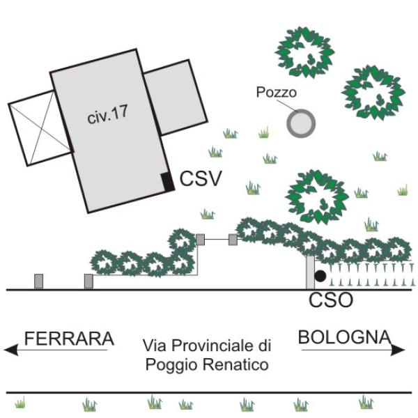 [{"simbolo_contrassegno":"B1","materializzazione":"(CSO) – Bullone infisso su spalla del tombino posto a sinistra in direzione di Bologna."},{"simbolo_contrassegno":"V2","materializzazione":"(CSV) – Piastrina a barilotto infissa in prossimit\u00e0 dello spigolo di sinistra dell'abitazione, visibile da lato strada."}]