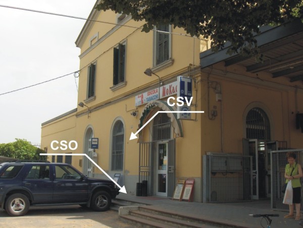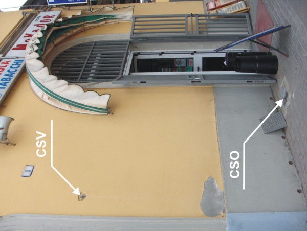 | Contrassegni | [{"simbolo_contrassegno":"P5","materializzazione":"(CSO) – Pozzetto rialzato con tubo in PVC, coperto da tappo in ghisa e da chiusino quadrato 30 X 30 anonimo posto a sinistra dell'ingresso al bar al civico 1."},{"simbolo_contrassegno":"V2","materializzazione":"(CSV) – Piastrina a barilotto infissa a sinistra del CSO."}] |