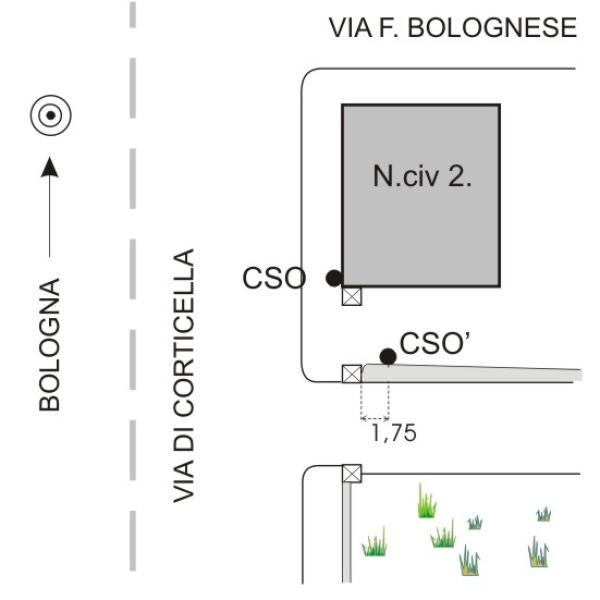 [{"simbolo_contrassegno":"B1","materializzazione":"(CSO) – Bullone infisso in prossimit\u00e0 dello spigolo destro della facciata del fabbricato posto al n.c. 2 di Via Corticella."},{"simbolo_contrassegno":"P4","materializzazione":"(CSO') – Pozzetto Quadrato, interrato di circa 20 cm, posto nel giardino a destra della casa, a filo marciapiede e a circa m 1,75 dal pilastro sinistro del cancello grande."}]