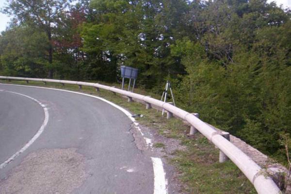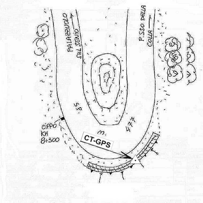 | Materializzazione | Centrino in acciaio inox murato sulla sommità della spalla del muro di sostegno alla base del guard-rail in prossimità del tornante posto presso Km 8 + 300 della S.P. 477. |