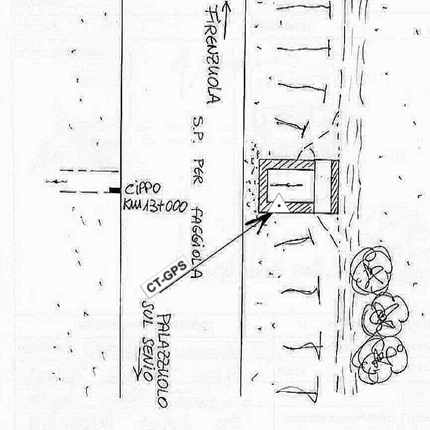 | Materializzazione | Centrino in acciaio inox infisso sulla sommità del muro del tombino stradale posto di fronte al Km 13+000 lungo la S.P. per Faggiola. |