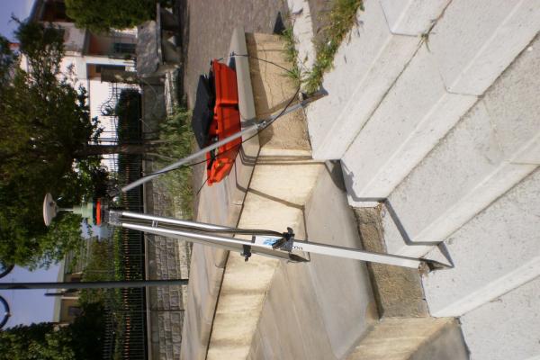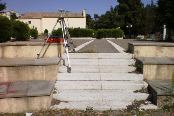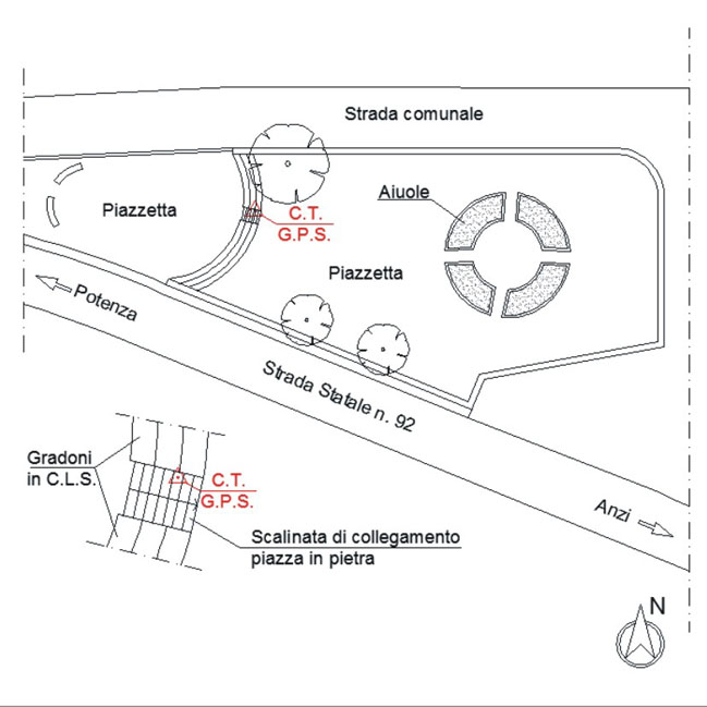 | materializzazione | Centrino metallico orizzontale di tipo chiodo con rondella ARPAB Regione Basilicata infisso sul terzo gradino dall'alto della scala in pietra che unisce i due livelli della piazzetta posta sul lato sinistro della Chiesa. |