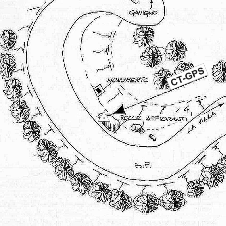 | Materializzazione | Centrino in acciaio inox murato su affioramento roccioso lungo la strada che da La Villa va verso Gavigno nei pressi del monumento in memoria di Aldo Pacini. |