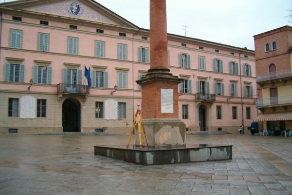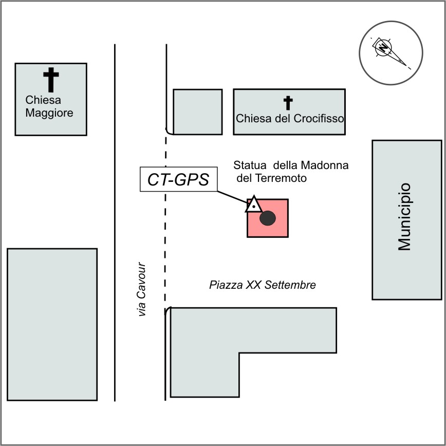 Centrino in acciaio inox del tipo "GPS C" infisso nel basamento in pietra serena della colonna della Madonna del Terremoto.