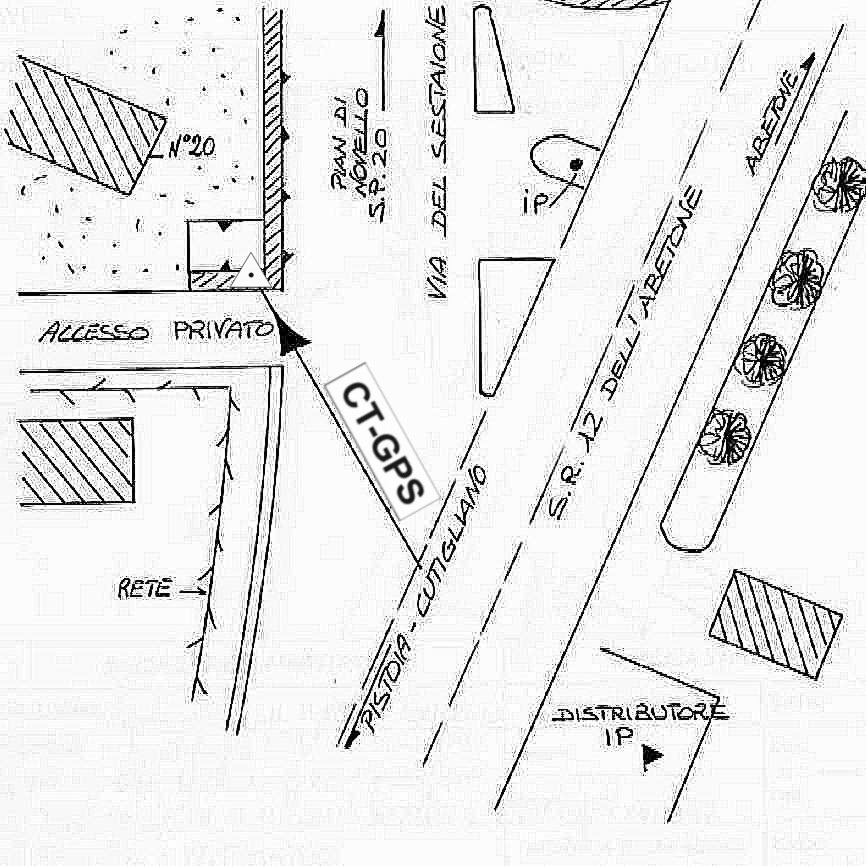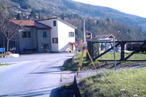Centrino in acciaio inox infisso su muretto del tombino stradale in prossimità dell'incrocio tra la S.R. 12 dell'Abetone e la S.P. 20 (Via del Sestaione) che porta a Pian di Novello e Pian degli Ontani, prativamente a Cutigliano.