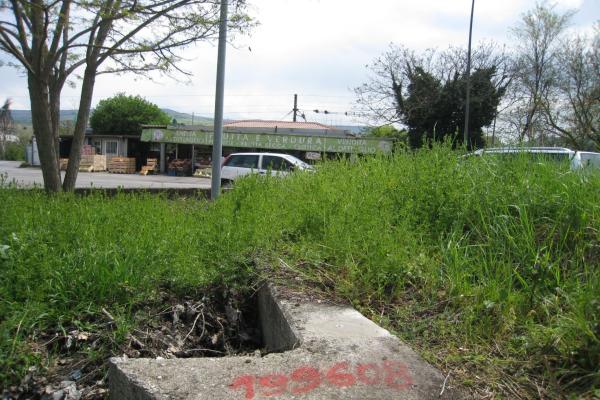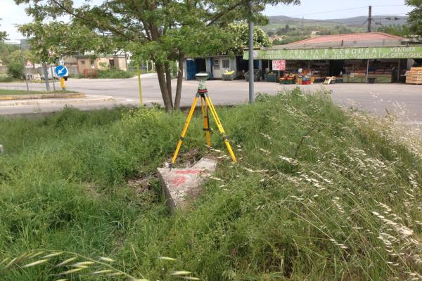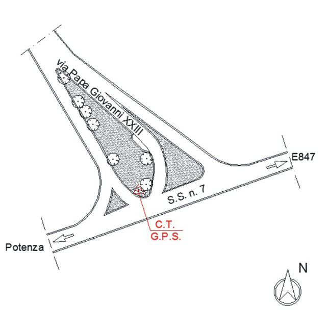 | materializzazione | Centrino metallico universale I.G.M. infisso sulla sommità del muro in cemento all'interno della grande isola spartitraffico sulla S.S. 7 al bivio per il Rione Macchia Romana. |