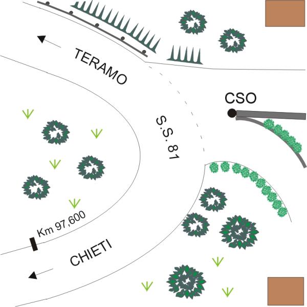 [{"simbolo_contrassegno":"B1","materializzazione":"(CSO) – Bullone infisso sulla testa del muretto in c.a, in corrispondenza del bivio sulla curva,a destra in direzione Teramo."}]