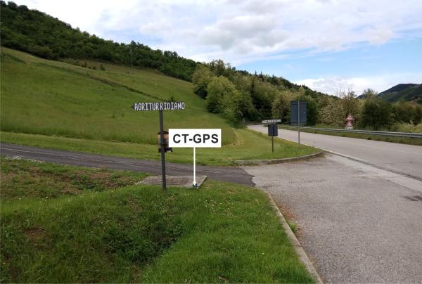 | Materializzazione | Centrino metallico infisso in corrispondenza dello spigolo del tombino in cemento posto al lato della S.P. 20, nei pressi del bivio per l'Agriturismo Ridiano. |