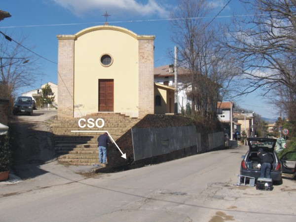[{"simbolo_contrassegno":"B1","materializzazione":"(CSO) – Bullone infisso sul muro di sostegno a mattoni sotto la scalinata di accesso alla chiesa."}]