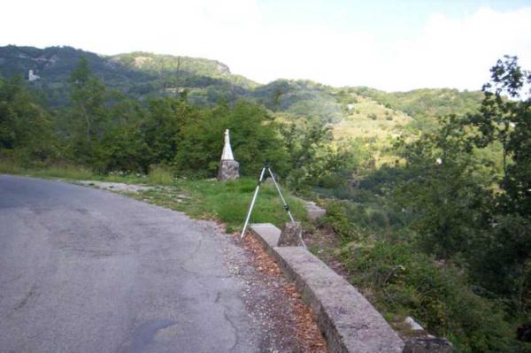 Centrino in acciaio inox murato sulla sommità del muro di contenimento a bordo strada presso un casotto e una statua votiva alla Madonna.
