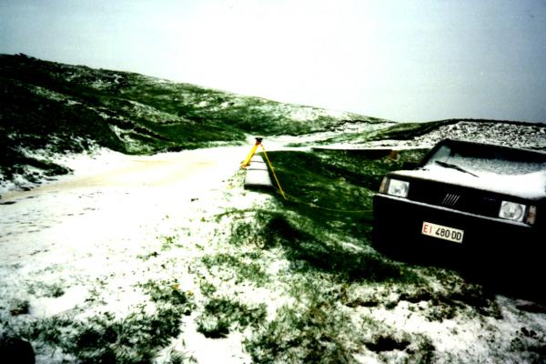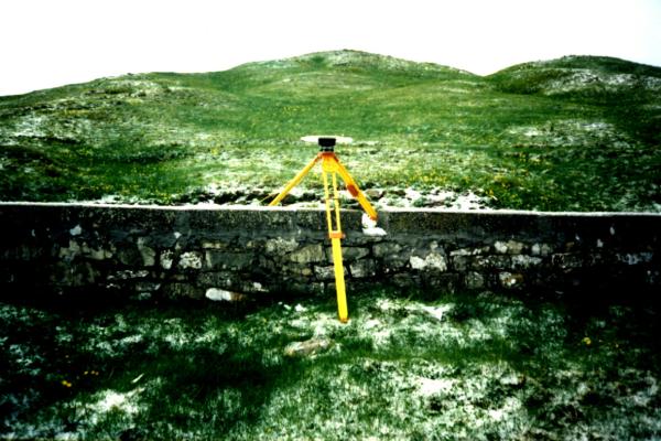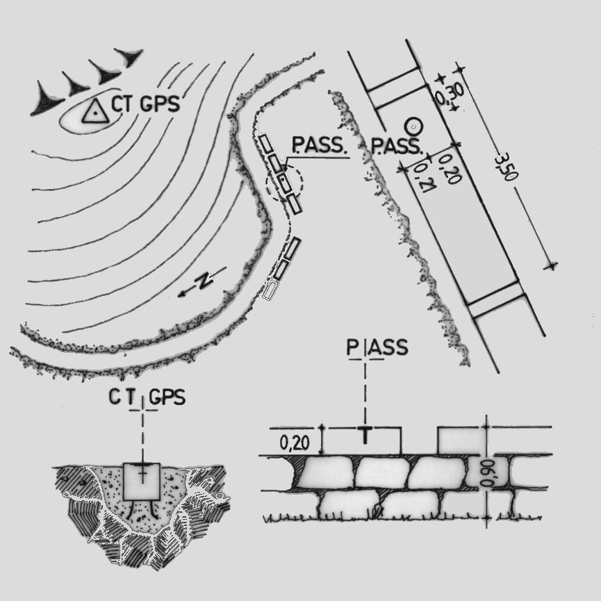 Centrino del tipo "GPS D" infisso alla sommità della cimasa in calcestruzzo armato del muro in pietra di contenimento della strada sterrata che conduce a Monte Albano, posto a circa 225 metri ad ovest del CT GPS.