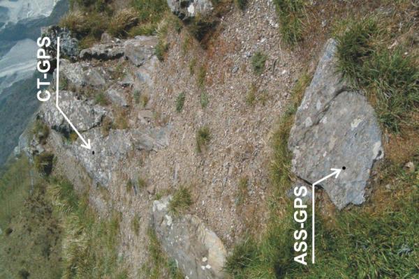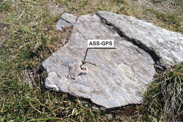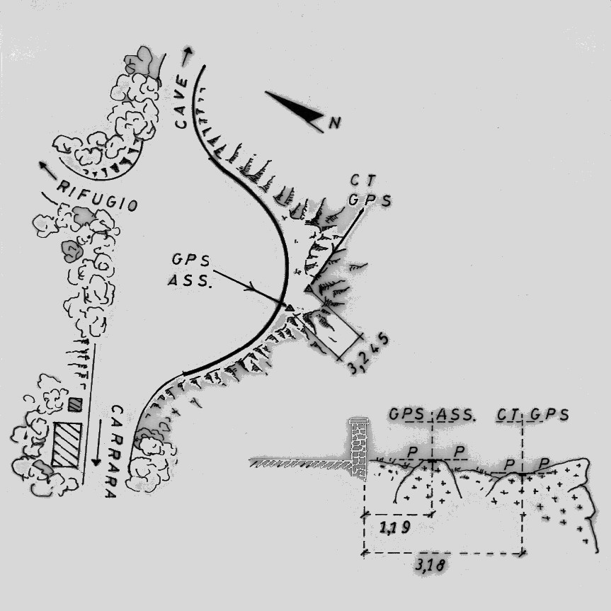 Gambo del centrino del tipo "GPS D" infisso su di una roccia sita sul lato esterno del parapetto che delimita il piazzale di Campo Cecina a circa 3.00 m a ovest del punto GPS.