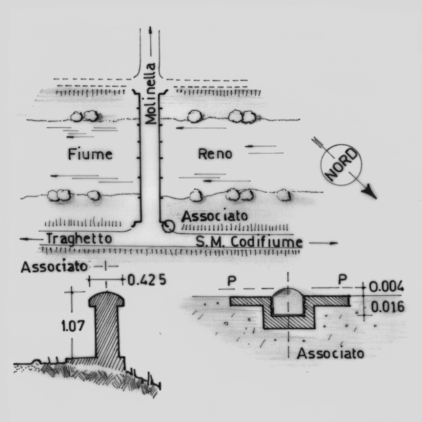 Asse geometrico del centratore in acciaio inox cementato sulla spalletta terminale, lato sinistro, direzione Argenta del ponte sul Fiume Reno(detto ponte di traghetto).