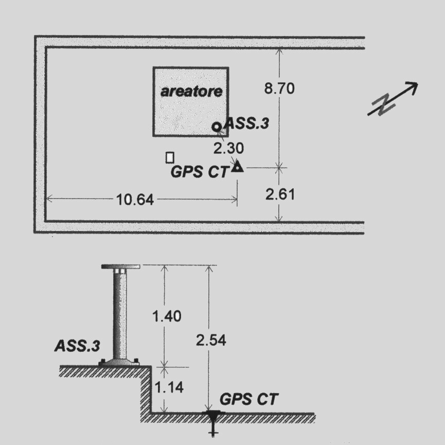 | materializzazione | Asse geometrico del pilastrino in ferro a sezione circolare sormontato da una piastra metallica con foro al centro, esistente sulla soletta di copertura dell'areatore posto alla sommità dell'edificio del Rettorato. |