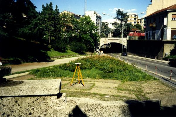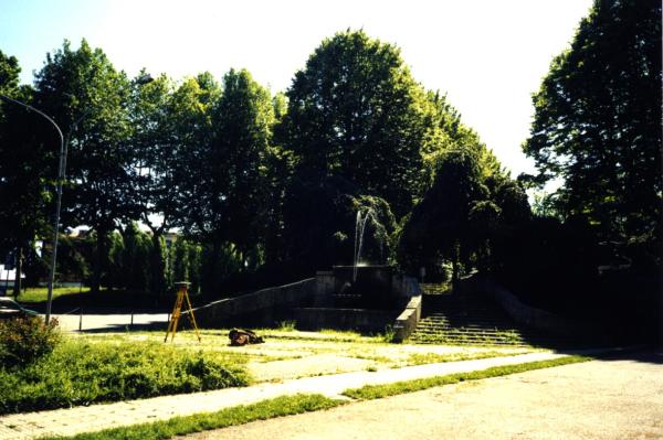 Centrino del tipo "GPS D" fissato sul pavimento in pilloli di fiume della fontana dei giardini in Via I Maggio.