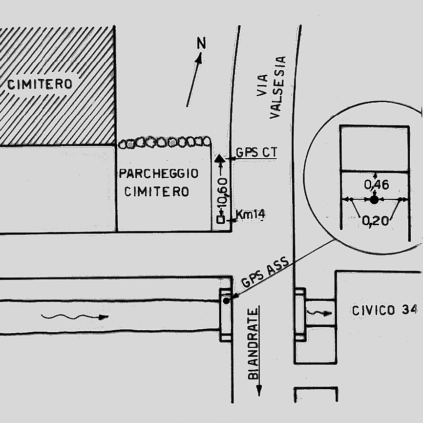 | materializzazione | Centrino di tipo "GPS D" fissato sul parapetto est del ponticello all'altezza del civico 34, subito a sud del cimitero. |