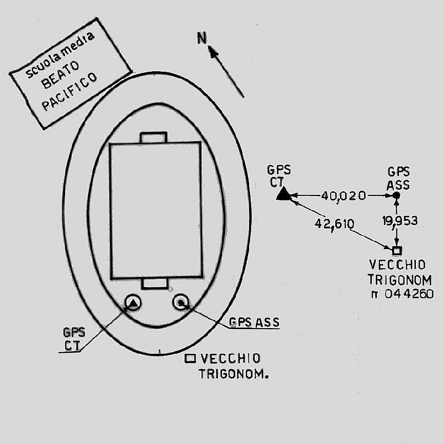 | materializzazione | Centrino di tipo "GPS D" cementato in corrispondenza dell'asse della piattaforma in cemento più ad est adibita al lancio del peso, situata fra la parte sud del campo da calcio e la pista di atletica nel nuovo campo sportivo di Cerano annesso alla Scuola Media "Beato Pacifico". |