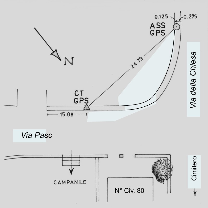 Centrino del tipo "GPS D" infisso sul muro di sostegno del terreno a destra, andando verso il cimitero, su Via della Chiesa.