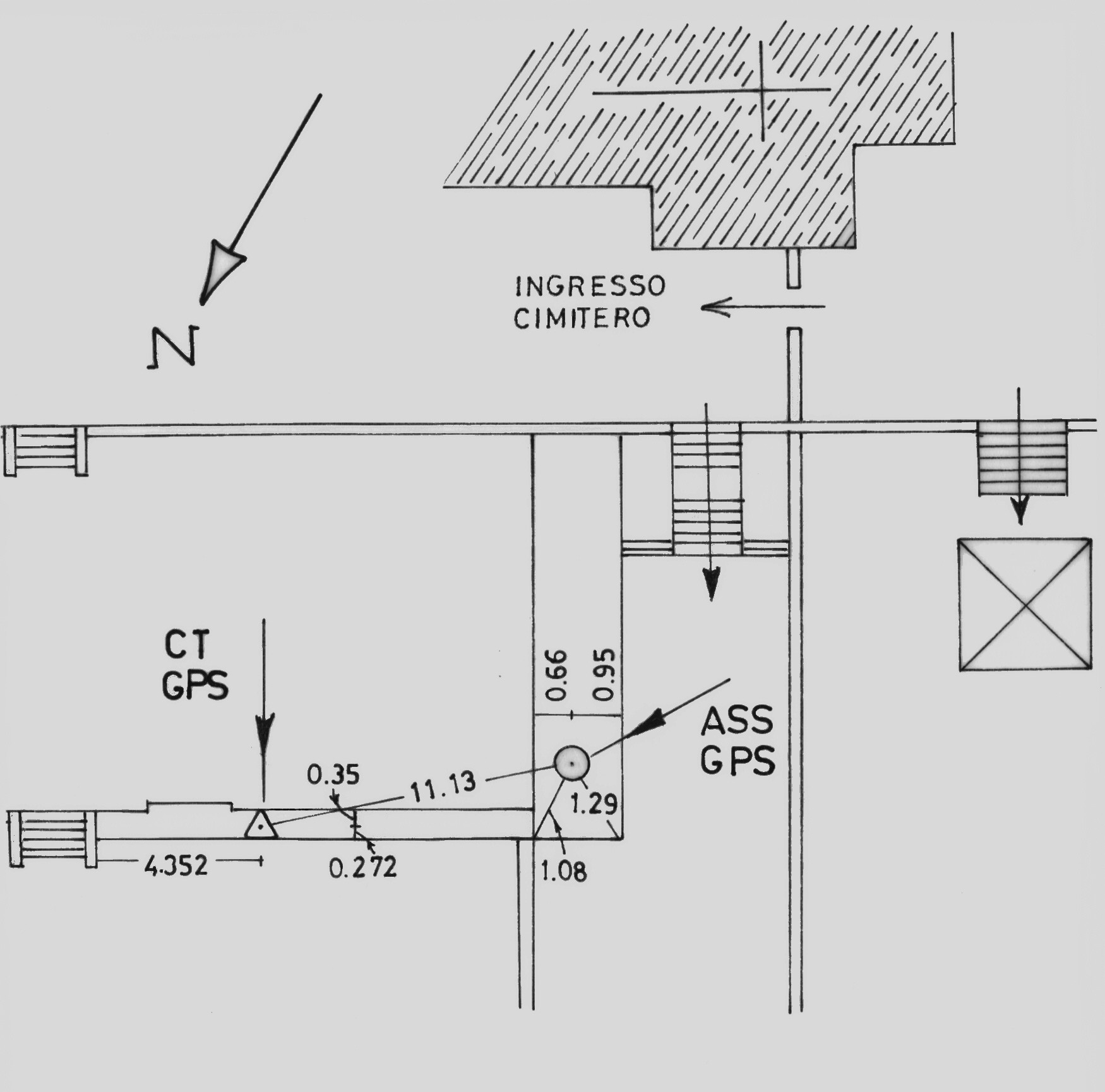 | materializzazione | Centrino di tipo "GPS D" infisso sulla sommità della soletta in cemento armato, a copertura della fila dei loculi a destra della prima scala a sinitra dell'ingresso del cimitero. |