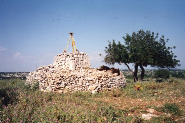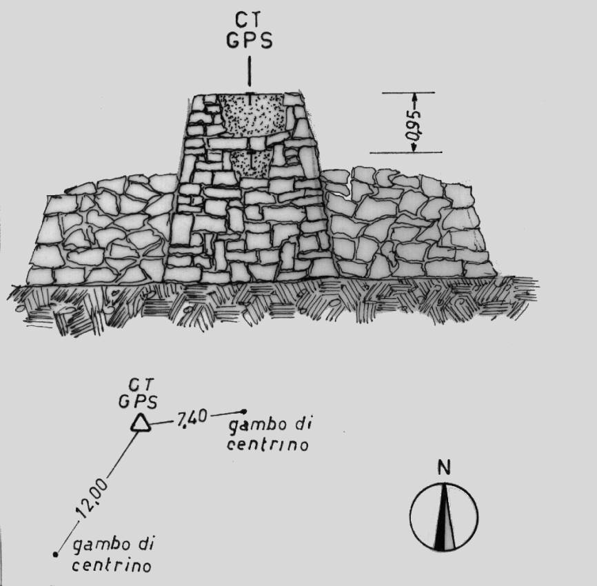 | materializzazione | Centrino di tipo "GPS C" infisso alla sommità del pilastro a forma tronco piramidale realizzato in pietrame a secco e cemento alla sommità. Si presume che in posizione coassiale, incorporato nella piramide, vi sia un centrino di superficie. |