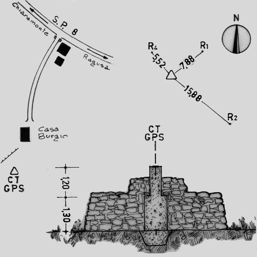 | materializzazione | Centrino di tipo "GPS A" fissato su preesistente centrino IGM del tipo di superficie alla sommità di un pilastrino in cemento armato con sottostante centrino di fondo a livello del suolo; il pilastrino si trova al centro di un basamento in pietrame a secco che lo ingloba. Riferimenti: R1 e R2 (centrini), R4 gambo di centrino. |