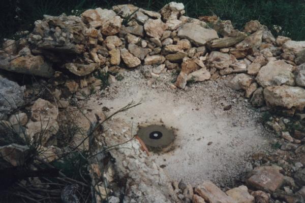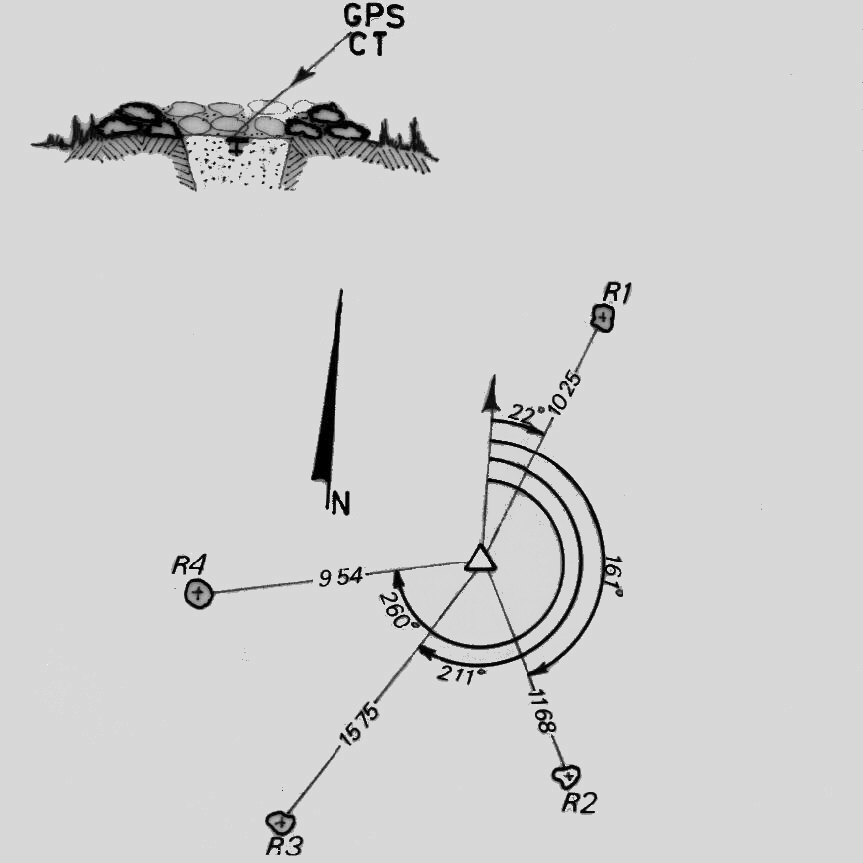 Centrino di tipo "GPS A" fissato in asse al centrino di superficie costituente il trigonometrico 272055. Riferimenti: n.4 centrini metallici.