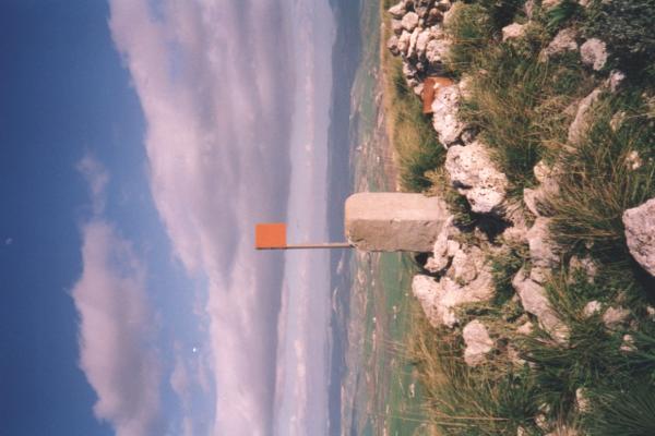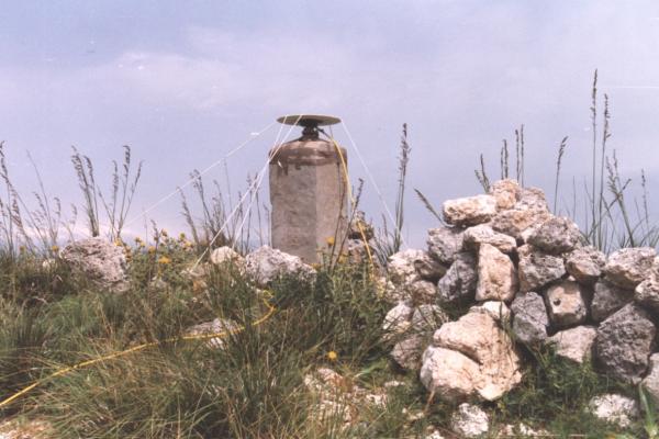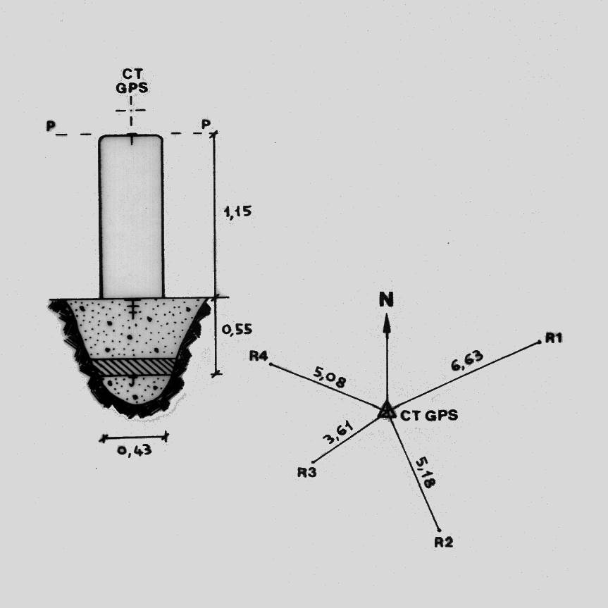 Centrino di tipo "GPS A" fissato sul preesistente centrino IGM del tipo di fondo posto alla sommità di un pilastrino in calcestruzzo con sottostanti centrino di superficie e centrino di fondo a cm 55 dal suolo, coassiali tra loro. Riferimenti: R1, R2, R3, R4 (centrini metallici).