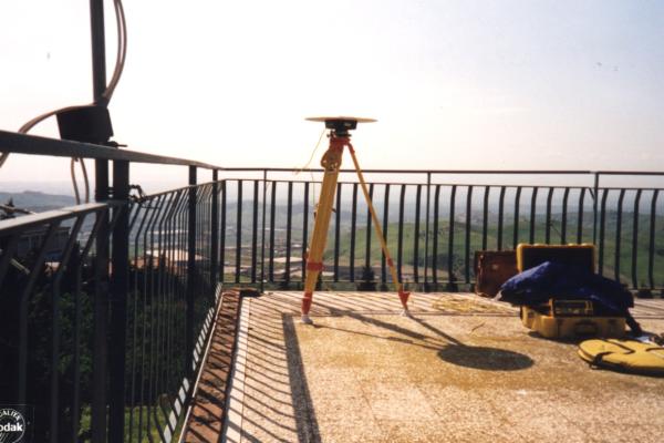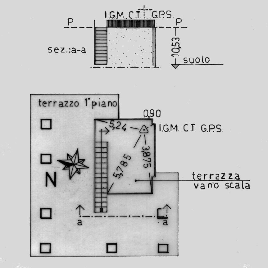 Centrino di tipo "GPS A" fissato su un preesistente centrino IGM del tipo di fondo solidale con la pavimentazione della terrazza a copertura del vano scala dell'edificio ubicato nella parte alta della Contrada Tiritì.