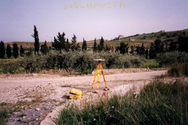 Centrino di tipo "GPS C" fissato sulla spalletta del ponte all'inizio della strada a fondo naturale per Castel di Iudica.