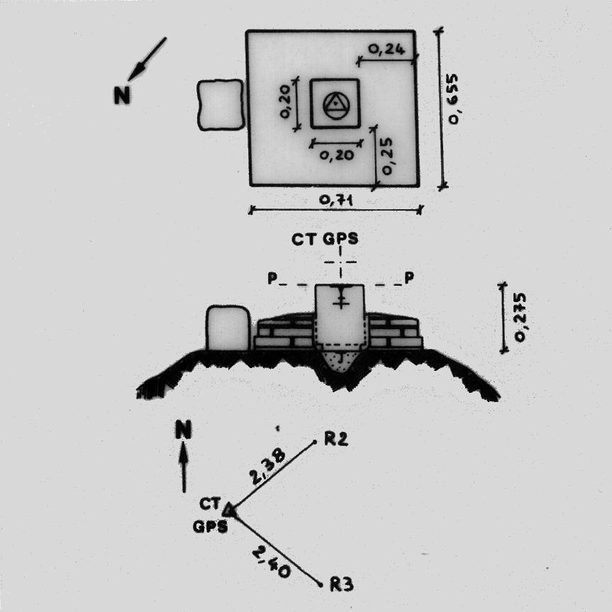 | materializzazione | Centrino di tipo "GPS A" fissato sul preesistente centrino IGM del tipo di superficie posto alla sommità di un blocchetto di calcestruzzo prefabbricato con sottostante centrino di fondo coassiale cementato su roccia. Riferimenti: R2, R3 (centrini metallici). |