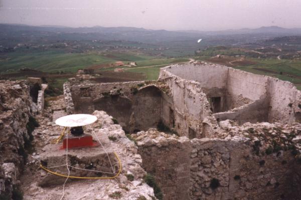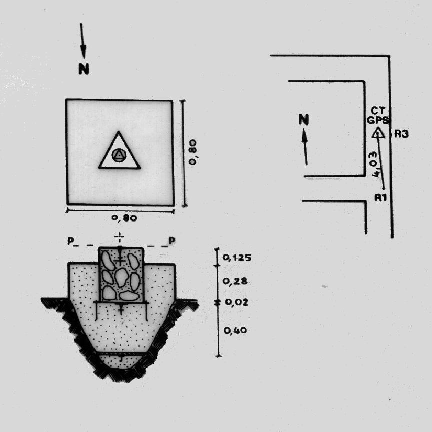 | materializzazione | Centrino di tipo "GPS A" fissato su preesistente centrino IGM del tipo di superficie cementato alla sommità dell'unico elemento rimasto di un pilastrino in ferro a sezione triangolare riempito di calcestruzzo con sottostanti centrini di superficie e di fondo cementati coassialmente, posto sul muro est del castello diruto sino sul monte. |
