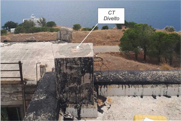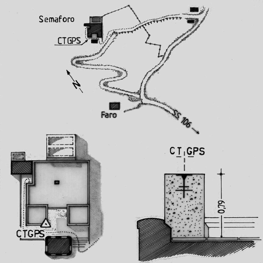 | materializzazione | Centro dell' impronta dell'antico centrino di superficie, posta alla sommità di su un pilastrino a pianta quadrata di calcestruzzo armato posto sullo spigolo sud dell'ala destra della terrazza soprastante il semaforo della Marina. |