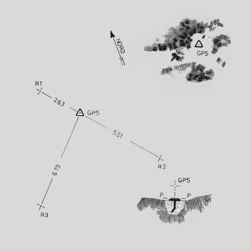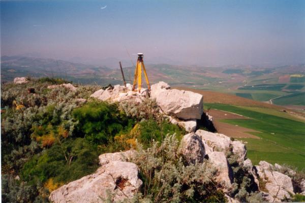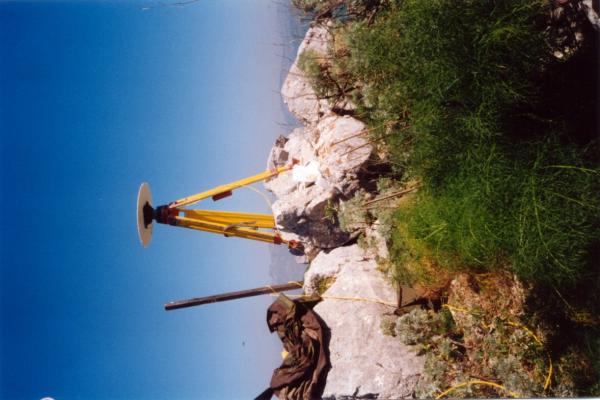 Centrino di tipo "GPS A" fissato su preesistente centrino di fondo IGM cementato su di una roccia ubicata sulla zona più alta del monte.