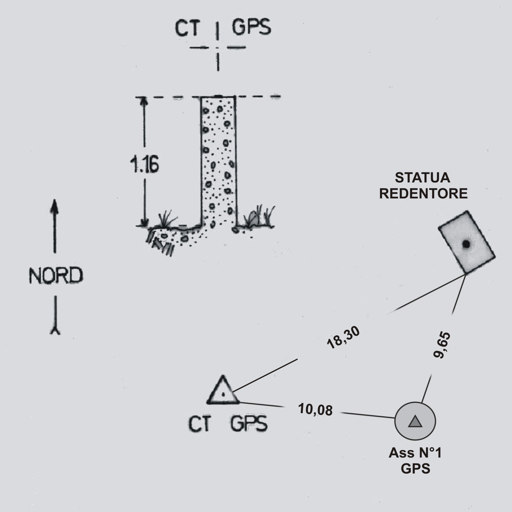 | materializzazione | Foro al centro del triangolo del centrino IGM del tipo di superficie fissato alla sommità del pilastrino in cemento armato. |