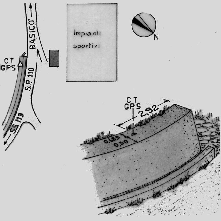 Centrino di tipo "GPS C" infisso alla sommità del muro a retta in cemento a lato della S.P. 110, al Km. 15,700, all'altezza degli impianti sportivi comunali.