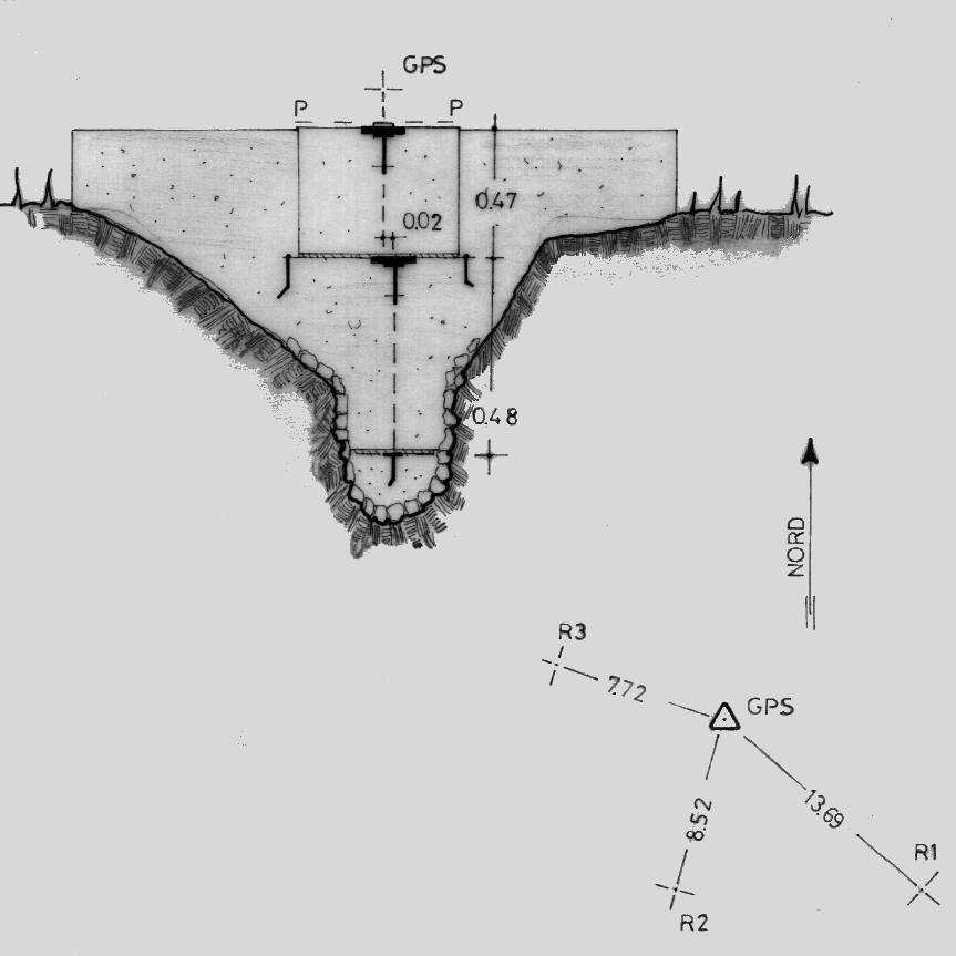 | materializzazione | Centrino del tipo "GPS A" fissato su centrino di superficie IGM cementato al centro di una platea in cemento. Sottostante, disassato di 2 cm verso nord-est ulteriore centrino di superficie IGM e ancora centrino di fondo. |