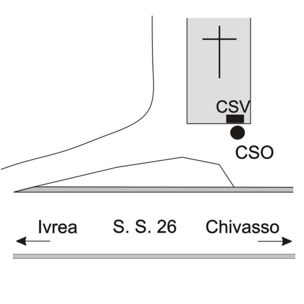 [{"simbolo_contrassegno":"P3","materializzazione":"(CSO) – Pozzetto posto alla base della facciata, a 1,20 m dallo spigolo destro e a 0,50 m dal muro."},{"simbolo_contrassegno":"V1","materializzazione":"(CSV) – Mensola infissa sulla facciata, presso lo spigolo destro."}]