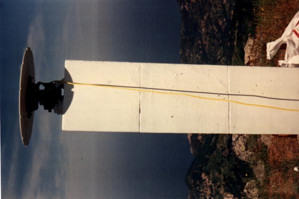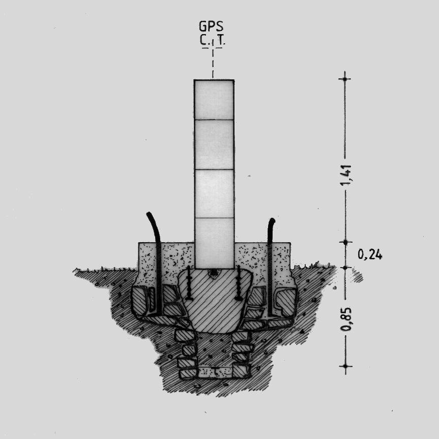 Centrino di tipo "GPS A" fissato alla sommità del pilastrino in ferro a sezione triangolare, in corrispondenza del suo asse geometrico, e sottostanti centrini di fondo coassiali, sulla estremità sud della cresta rocciosa del monte omonimo.