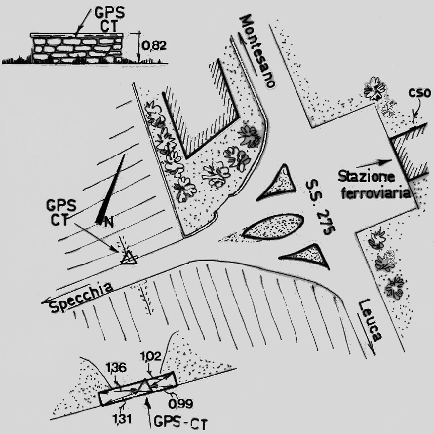 Centrino di tipo "GPS C" fissato sulla soletta in calcestruzzo del piccolo ponte in prossimità della stazione sulla strada che congiunge la stazione stessa e Specchia.